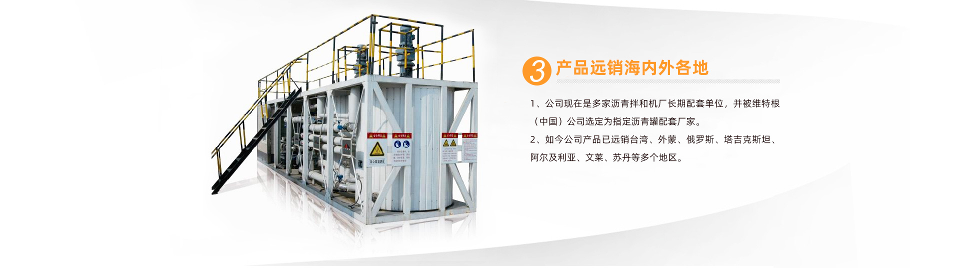 經(jīng)多年的努力,在行業(yè)內(nèi)已具有知名度及品牌影響力,獲得多家業(yè)內(nèi)企業(yè)的認(rèn)可,公司現(xiàn)在是多家瀝青拌和機(jī)廠長(zhǎng)期配套單位,并被維特根(中國(guó))公司選定為指定瀝青罐配套廠家。如今公司產(chǎn)品已遠(yuǎn)銷臺(tái)灣、外蒙、俄羅斯、塔吉克斯坦、阿爾及利亞、文萊、蘇丹等多個(gè)地區(qū)。 ...... 【查看詳情】